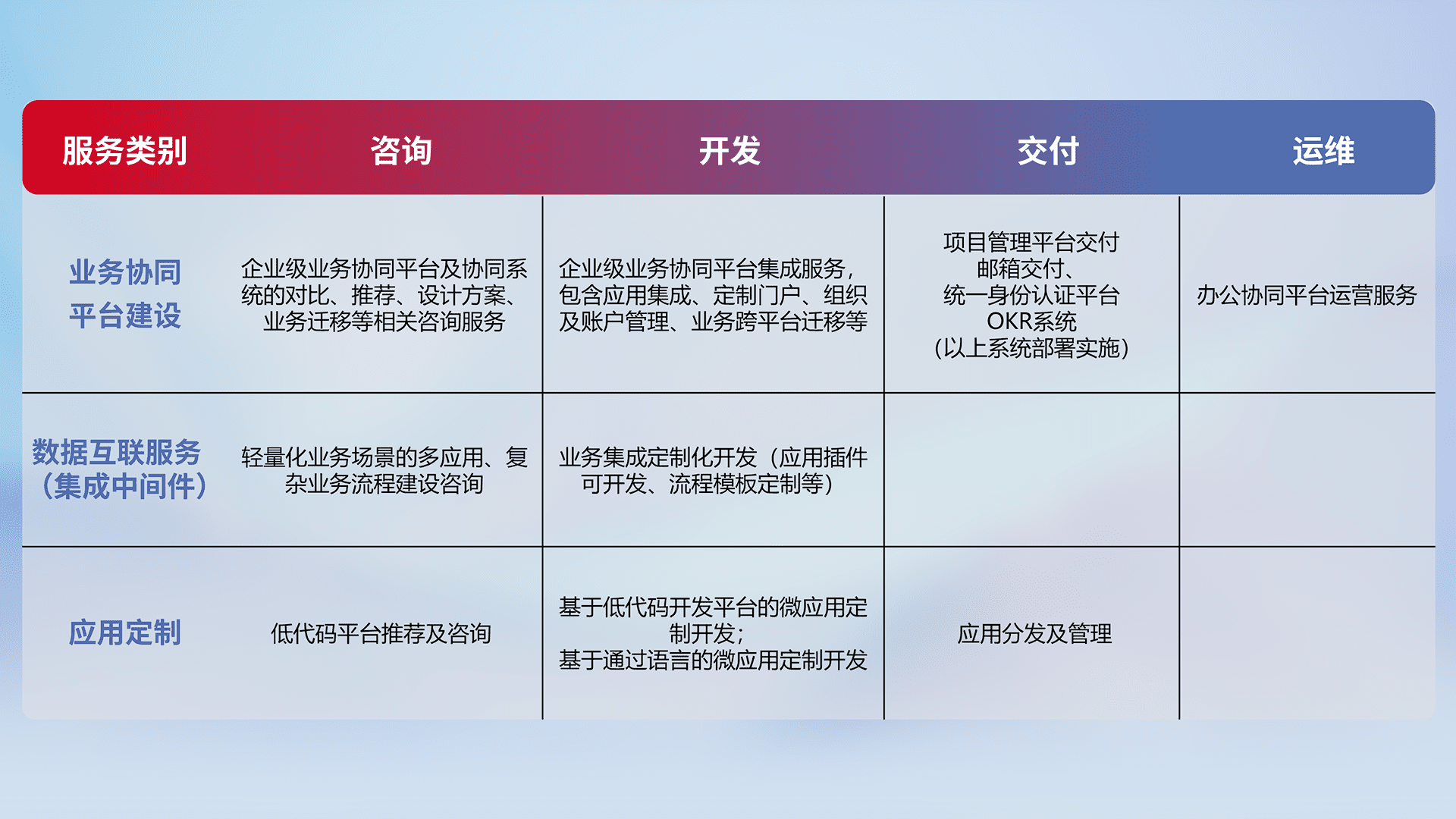 针对钉钉、、、、企微、、IDaas等平台级产品提供产品的规划、、、、方案、、交付、、、定制化开发等服务,,实现如统一协同办公、、、智能客户服务、、混合会议管理、、、、智能数据查询、、等业务场景,,实现数字化转型。。